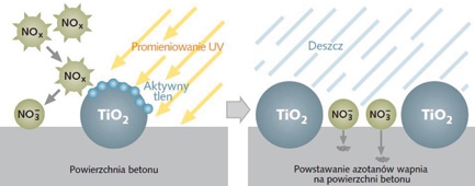 Fotokatalitycznie aktywne powierzchnie betonu wykonanego z użyciem cementu TioCem wykazują działanie redukujące w przypadku szkodliwych tlenków azotu NOx, obecnych w spalinach emitowanych przez silniki pojazdów. Zastosowanie cementu TioCem pozwala zredukować szkodliwe tlenki azotu NOx na drodze procesów fotochemicznych i utlenienia, do nieszkodliwych jonów azotanowych. W końcowej fazie procesu jony azotanowe tworzą na powierzchni betonu kwas azotowy, który następnie w wyniku reakcji ze składnikami zaczynu cementowego tworzy sole (azotany) neutralizowane i spłukiwane przez opady atmosferyczne. Schematycznie redukcję tlenków azotu NOx przez fotokatalitycznie aktywne powierzchnie betonu przedstawia poniższy rysunek.